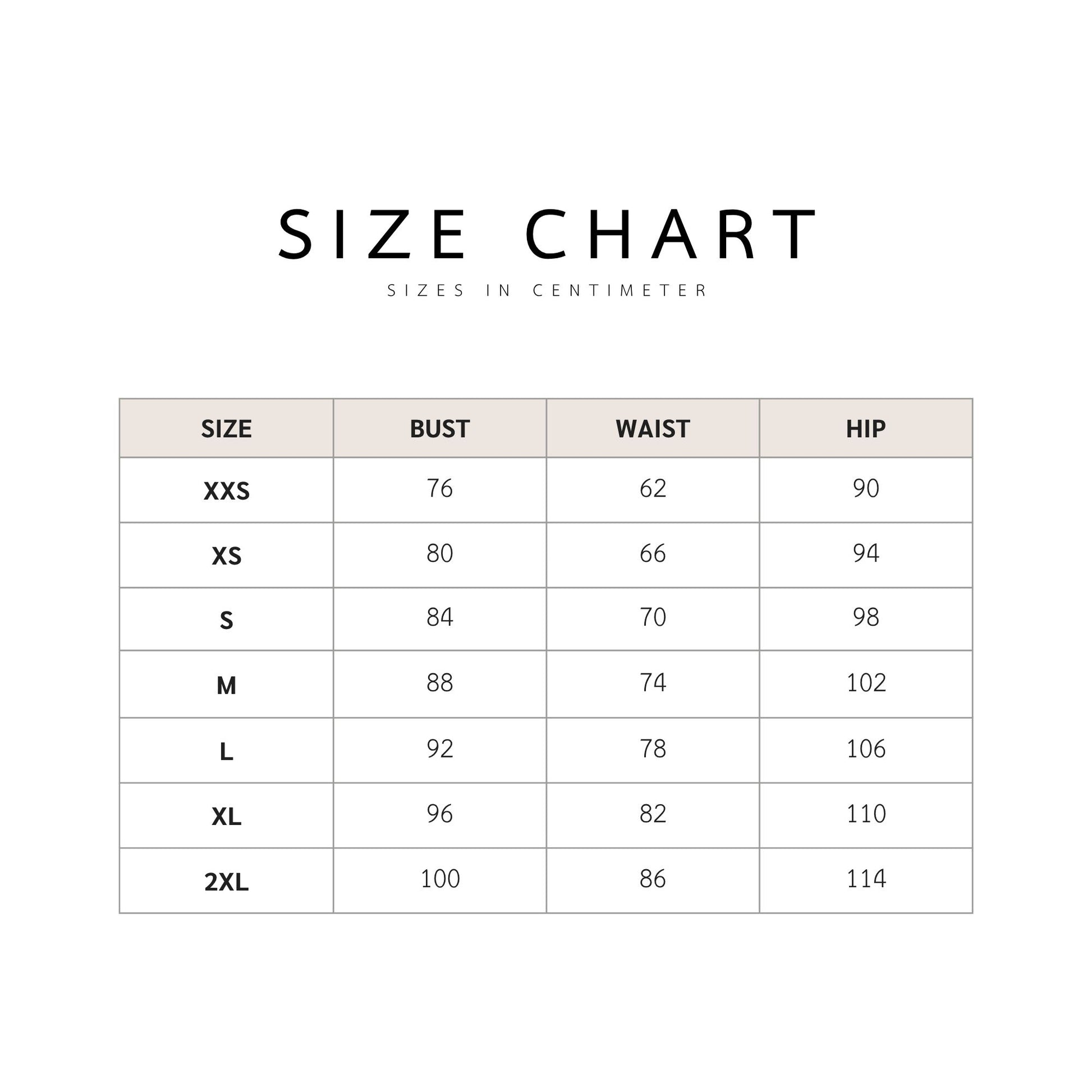 A size guide for sizes XXS – XXL (EU 32–44)